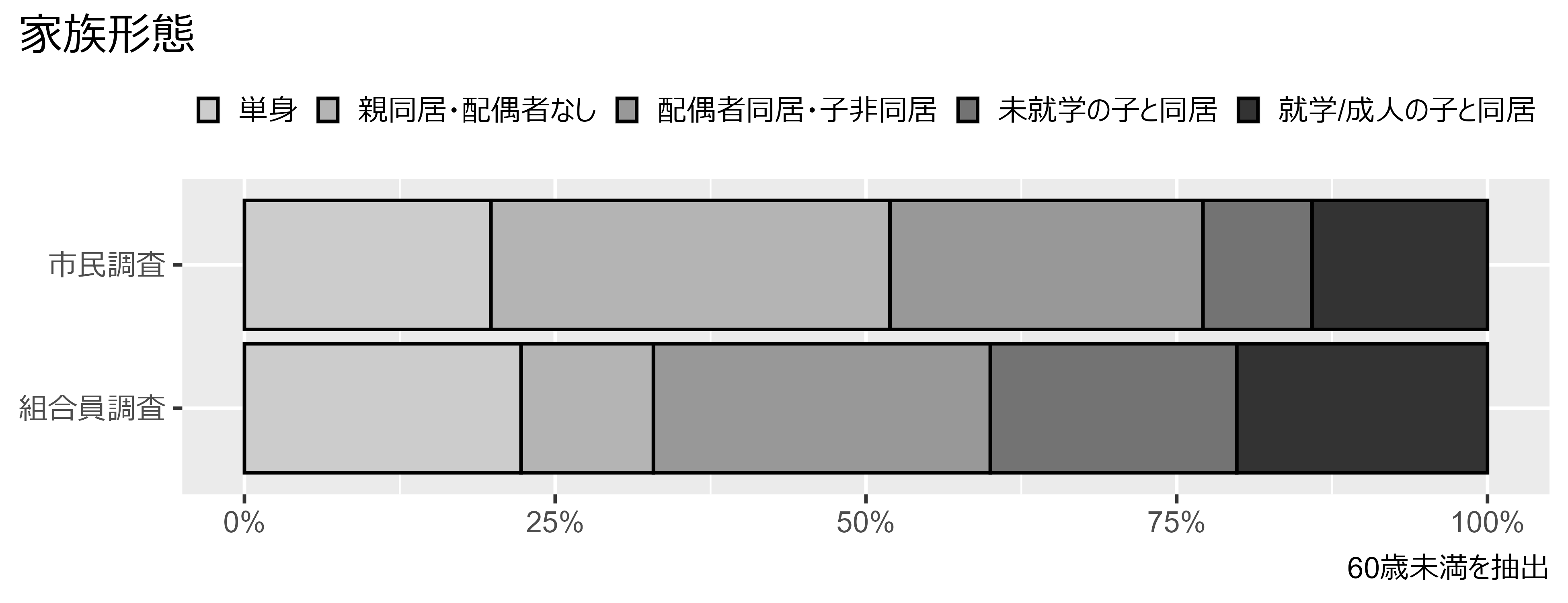 市民調査と組合員調査を並行して実施することで、まず浮き彫りになるのは、組合員に比べて地域住民全体の生活状況が多様だということである。ここでは一例として、家族形態を比較しよう。下図は、家族形態の分布を示したものである(比較の条件を揃えるために、60歳未満を抽出している)。一見して分かるのは、組合員に比べて地域住民全体では未婚者の比率が高く、子どもがいる世帯も少ないということである。言い換えれば、「結婚して子どもをもつ」という人生を想定できるかどうかという基本的な点で、組合員と地域住民全体とでは大きな差がある。