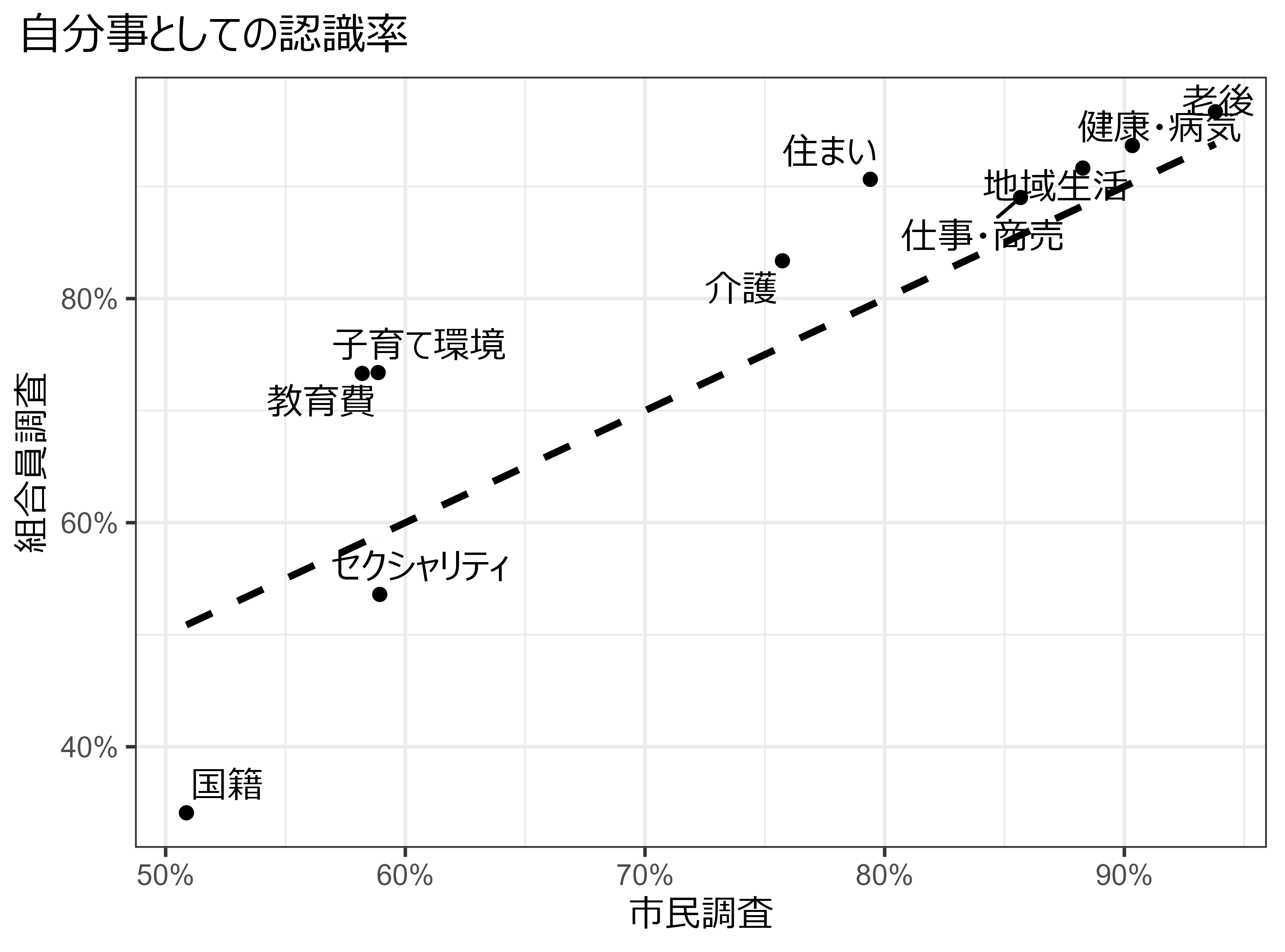 ここでは、これら各項目を「自分事」として捉えている(「あてはまらない」と答えなかった)ひとの比率を比較しよう(下図)。横軸(地域住民全体)に比べて組合員(縦軸)の値が顕著に高いのは、「子育て環境」と「教育費」である。一方、組合員の値が顕著に低いのは「国籍」で、「セクシャリティ」もやや低い。地域住民全体を基準として見れば、組合員は結婚して子どもをもつという人生設計を描きやすく、一方で自身や家族のマイノリティ性を「気にしなくてよい」ひとが多いといえる。