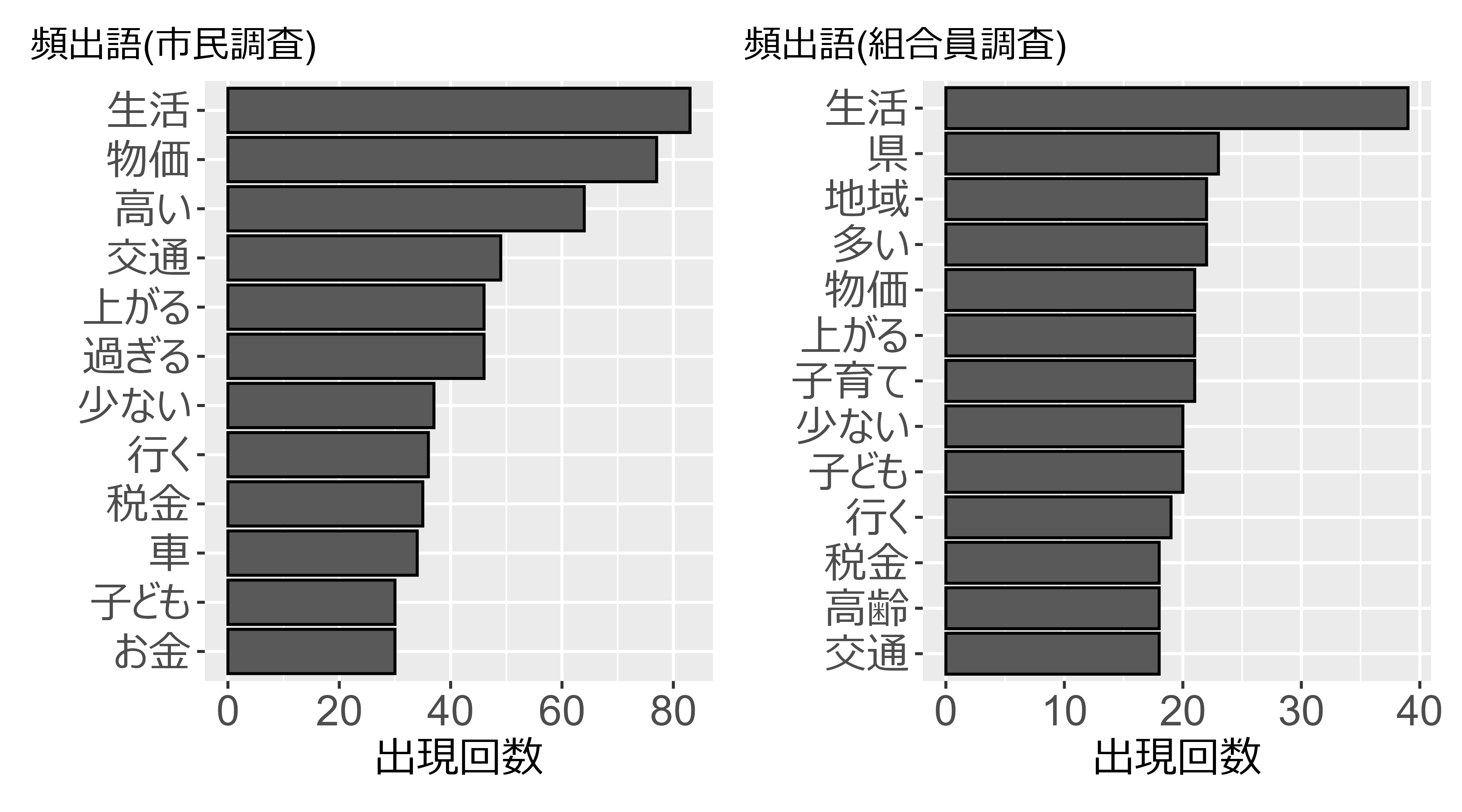 こちらもインタビューで言及されている自由記述の分析としては、自由記述の文字データを形態素解析(単語への分解)にかけ、各調査の頻出語を図示した図を紹介したい(下図)。両調査を比べてまず気がつくのは、地域住民全体の自由記述には「物価」「高い」が頻出していることである。一方、組合員調査では「物価」と同じ頻度で出現する「子育て」が、市民調査には登場しない。この結果からも、現在の生活における関心や意識の違いを見てとることができるだろう。