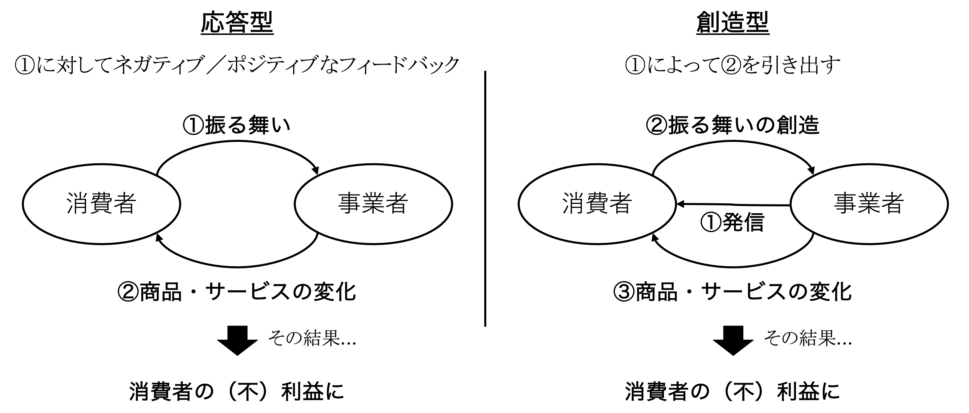 今回の経験からもう一つ考えたことがあります。それは、消費者と事業者の双方の利益に資するような消費者教育には少なくとも2種類のかたちがあるのではないかということです。たとえば、冒頭で挙げたカスハラ防止の発信のような消費者教育は、消費者の振る舞いに対してポジティブあるいはネガティブなフィードバックをする、「応答」型ともいえるようなかたちの消費者教育です(図1左)。他方、「この仕事にはこういう専門性がある」「こんな工夫で商品・サービスを支えている」といった現場の努力や働きぶりを消費者に伝え、それに応じた消費者の振る舞いを引き出し、事業者やその従業員と消費者とのよりよい関係を構築していく(ひいては、よりよい消費社会を構築していく)、このような「創造」型の消費者教育もあると考えられます(図1右)。こうした「創造」型の消費者教育は、従業員や組合員主導で消費者との望ましい関係をつくることでもあり、従業員や組合員の働きがいを下支えすることにもなると思われます。その結果として商品やサービスの質向上につながり、そのメリットは消費者にも返ってくるでしょう。